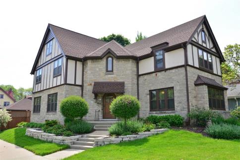 A beautifully landscaped yard welcomes you to this Urban Castle on Historic Sherman Boulevard. You'll find many striking architectural details in this Tudor style home that combines the best features of Gothic Revival, Mediterranean and Arts & Crafts design. As you step through the turret entry, a striking curved staircase, arched doorways, decorative plaster walls and terrazzo floors opens to the dining and living rooms. Beamed 9 foot ceilings and marble fireplace complement a grand living space. The dining room with plaster ornamental accents is adjacent to a fabulous sunroom with terra cotta floors, a Cloister Vault ceiling and a Batchelder tile fountain. Wrapped in sunlight, this room is a perfect place to read or listen to music. A stunning kitchen designed by Wisconsin Kitchen Mart combines modern amenities with the style and craftsmanship of a by-gone era. Granite counters, center island, and built-in china cabinets in the sunny ‘breakfast’ room. Upstairs, you’ll find extra large bedrooms with huge closets, beautifully tiled bathrooms and a private balcony overlooking the backyard. Beautifully landscaped, private and fenced, this outdoor entertaining space features 2 stamped concrete patios and garden space. There is even an original Rathskeller with a fireplace in the basement! State of the art heating system, exceptional storage, huge room sizes, amazing closets, the fenced backyard is relaxing and private - an entertaining sanctuary.